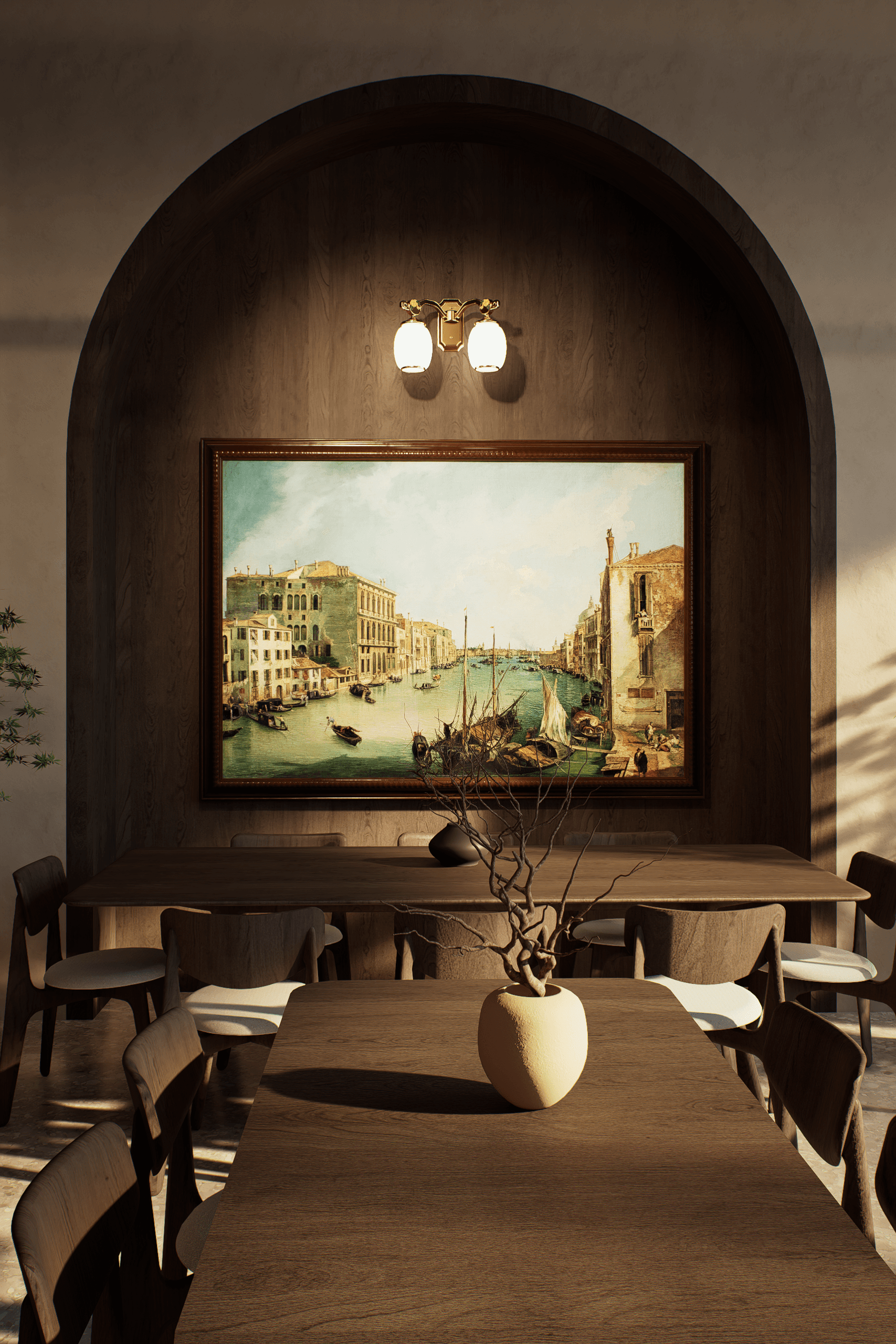 A kitchen of quiet elegance, where arched walls, soft light, and natural wood create a timeless Mediterranean calm